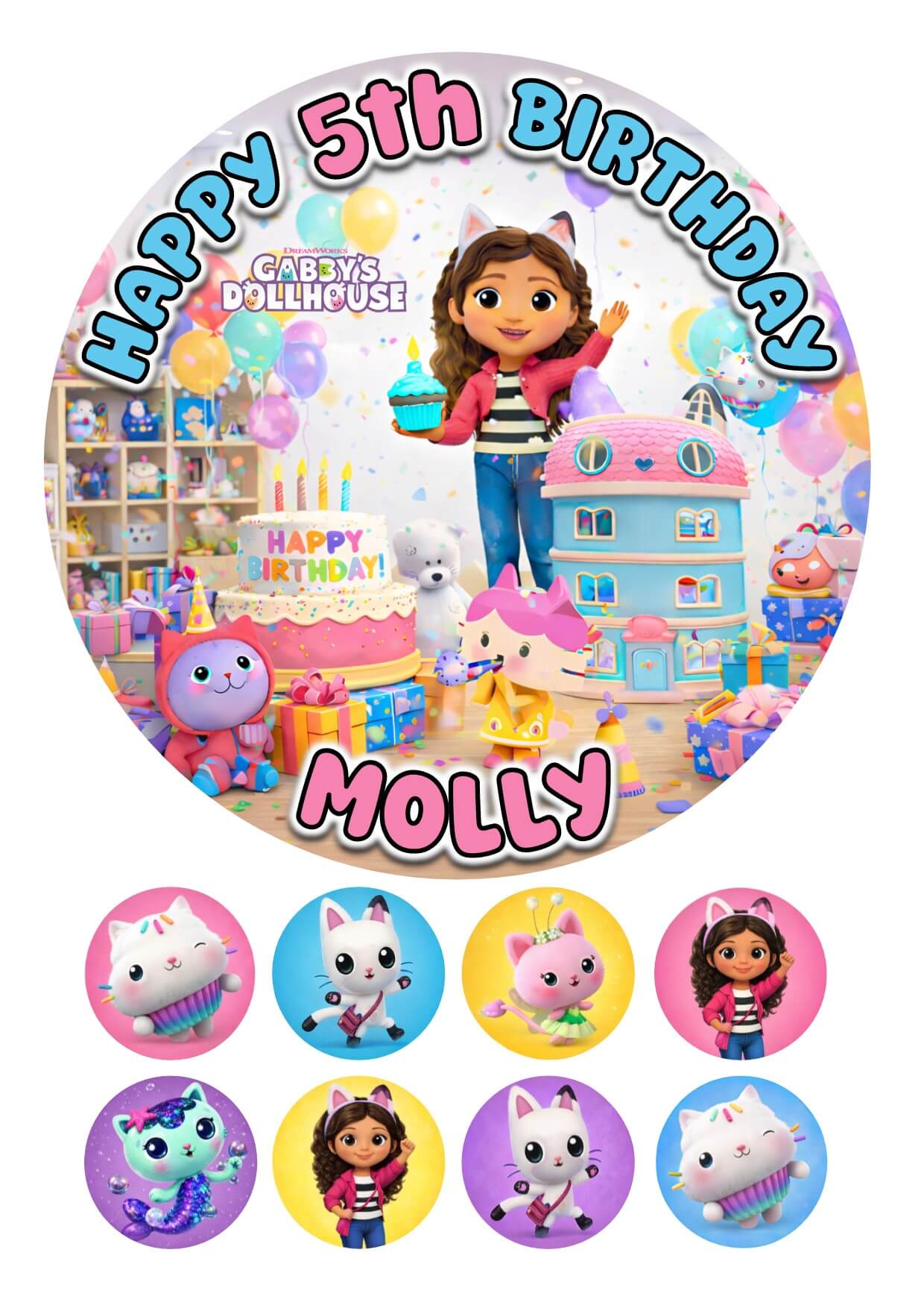 Gabby's Dollhouse Icing Personalised Birthday Cake Topper & 8 Cupcake Toppers Gabby's Dollhouse Icing Personalised Birthday Cake Topper & 8 Cupcake Toppers